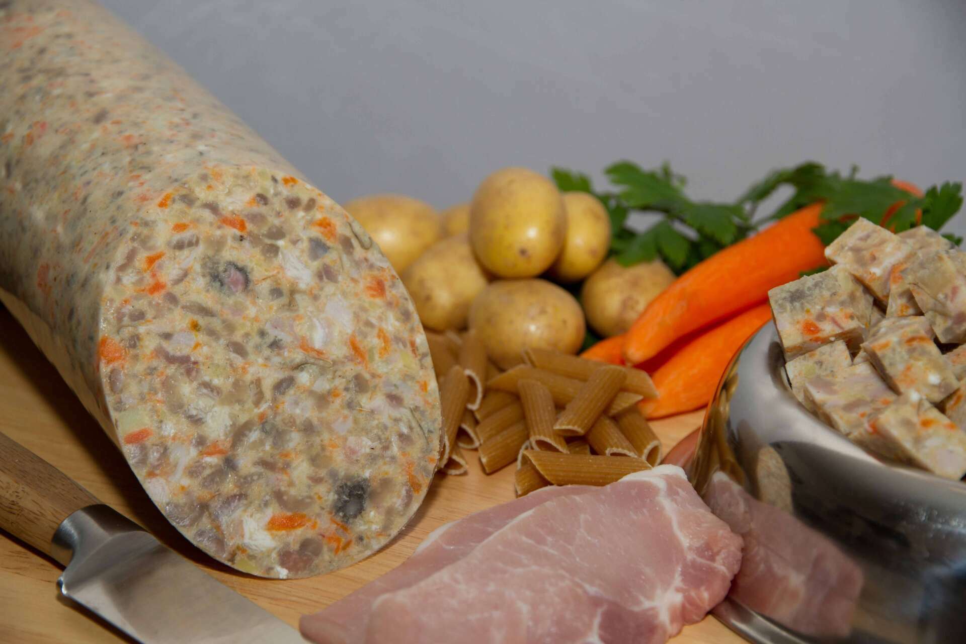 Pansen grün 50%, Schwarte (Schwein), Kartoffeln, Mohrrüben, Pansen geliert, Calciumcarbonat