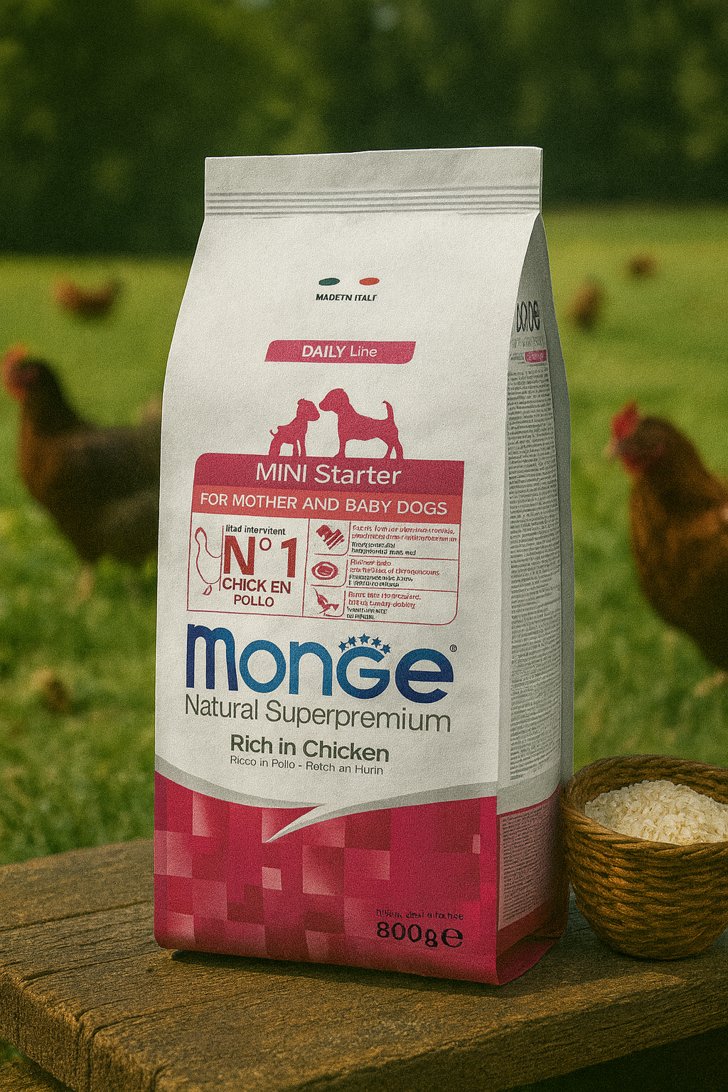 Monge Natural Superpremium Mini Starter für Mutter- und Babyhunde Rich in Chicken ist ein Alleinfuttermittel für Welpen in Minigröße und ausgewachsene trächtige und säugende Hündinnen (<10 kg).