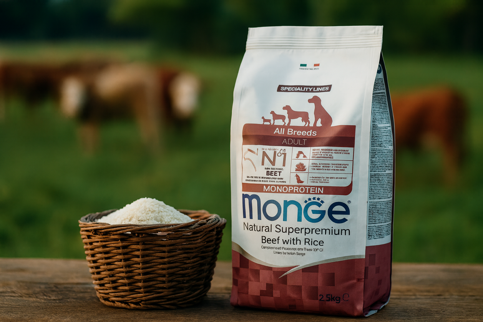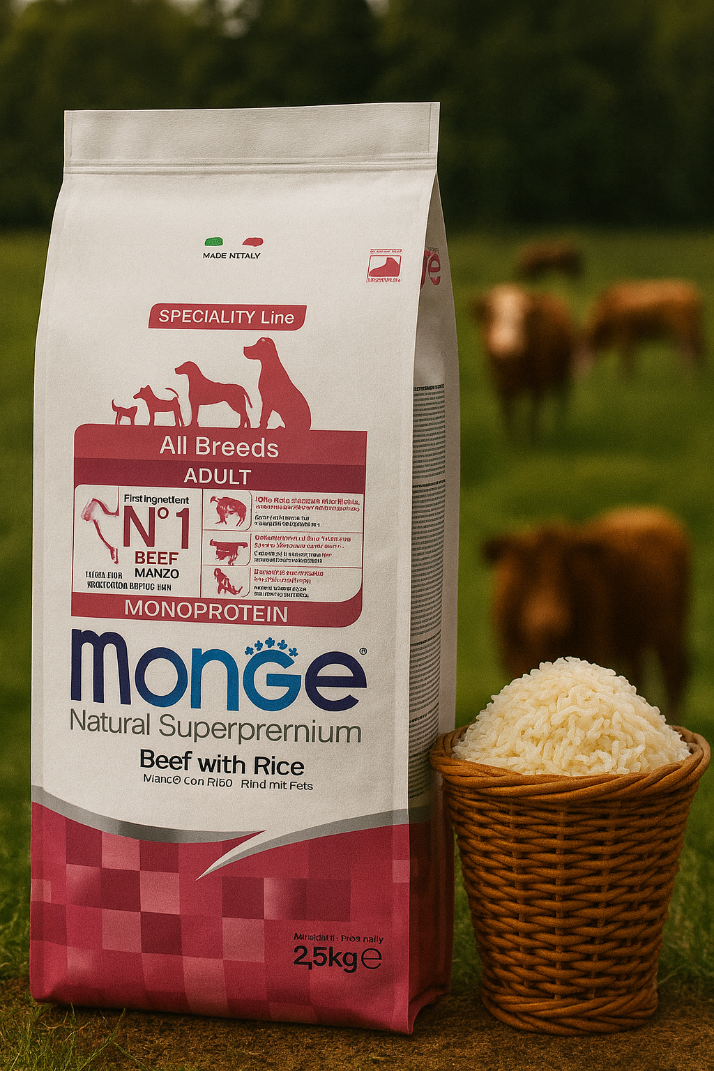 Monge Rind mit Reis ist eine Vollnahrung für erwachsene Hunde aller Rassen