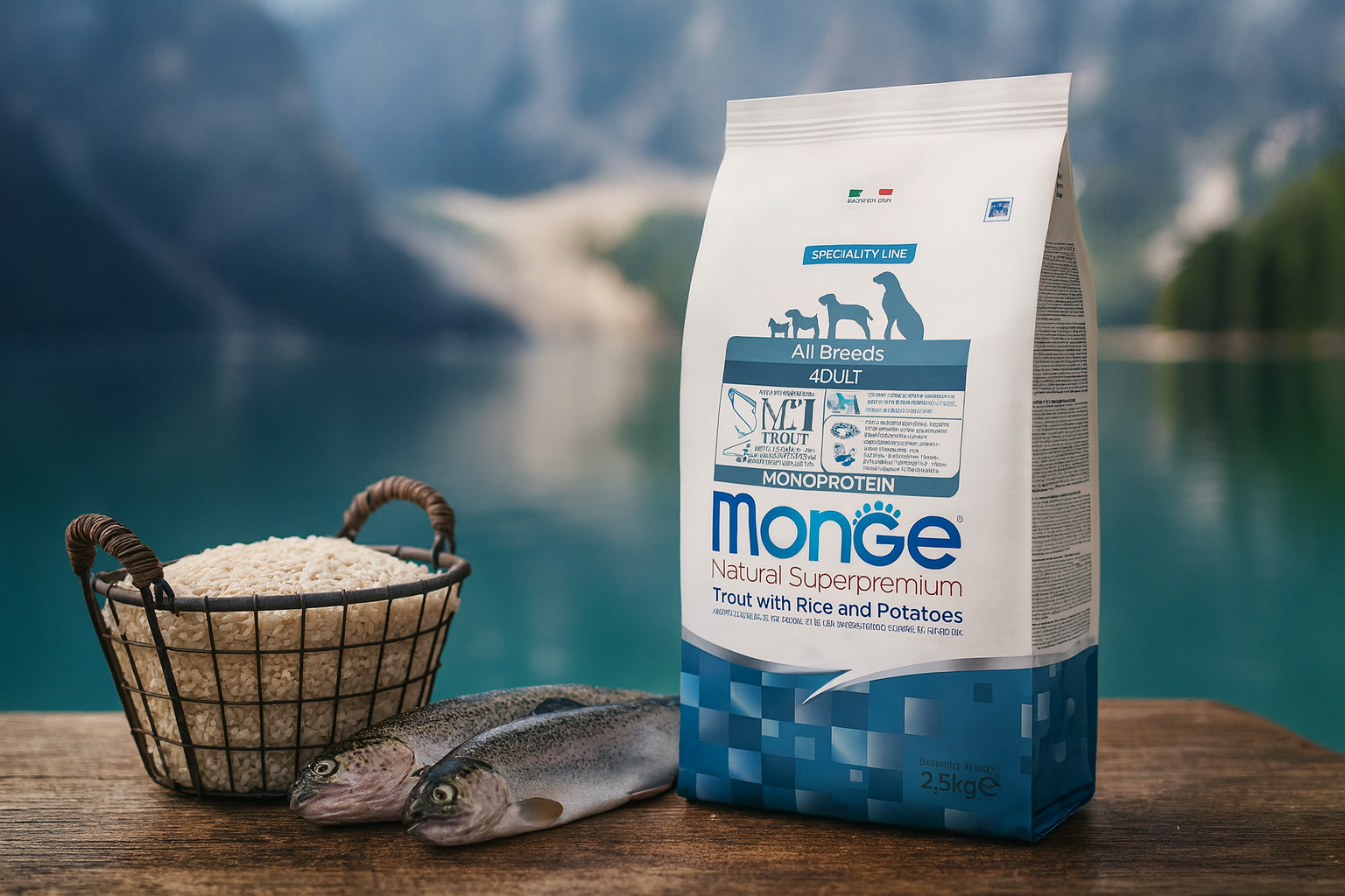 Die Sorte Forelle,Reis & Kartoffel ist eine neue Kreation der Monge Familie und auch für Hunde mit sensiblem Magen geeignet.Natürlich wieder Monoprotein.