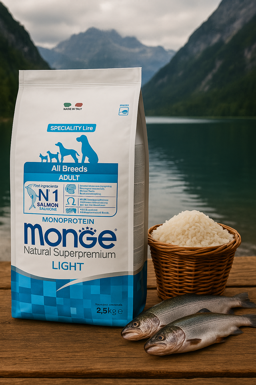 Hunde die zu Übergewicht neigen oder ihr Gewicht halten müssen sind mit Monge Light Lachs & Reis auf der richtigen Seite.Lachs ist fettarm,gesund und fördert ein gesundes,glänzendes Fell.