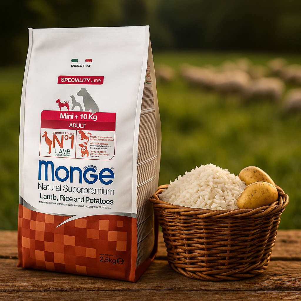 Monge Mini Adult mit Lamm,Reis & Kartoffeln ist eine Vollnahrung für kleine Hunde bis ca.10 Kg Gewicht.